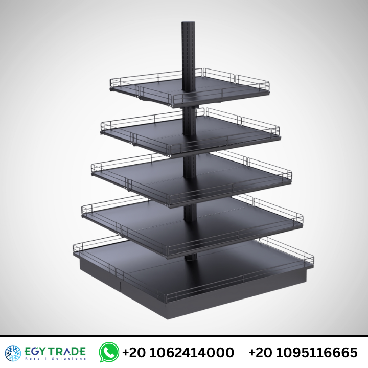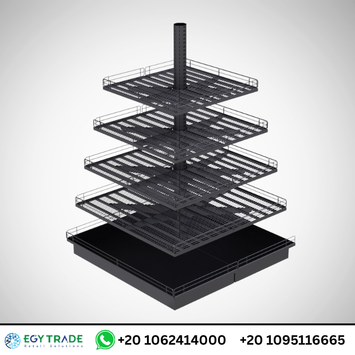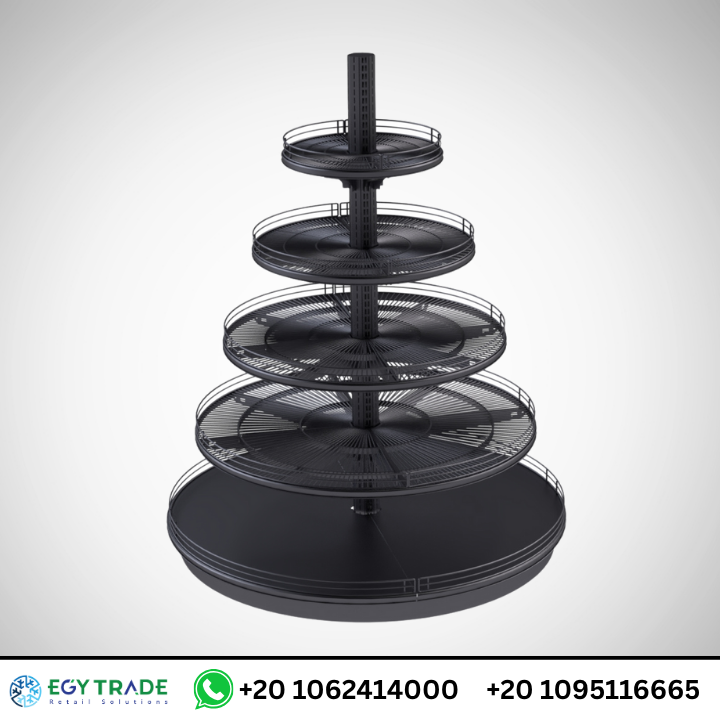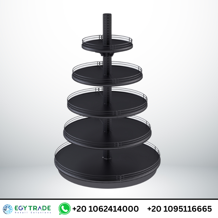 الوحدة تأتي بتصميم دائري متكامل يعتمد على عمود مركزي معدني قوي، تتفرع منه الارفف بشكل متوازن. هذا الهيكل يوفّر ثباتًا عاليًا ويضمن توزيع الأحمال بالتساوي، حتى مع الامتلاء الكامل للمنتجات.